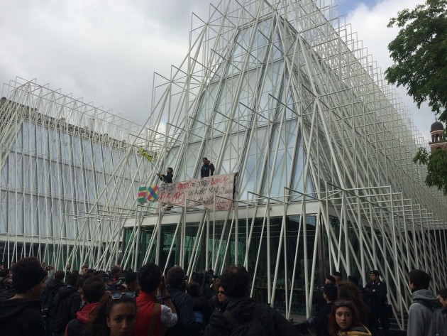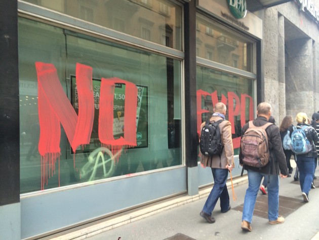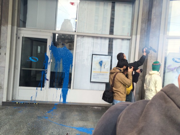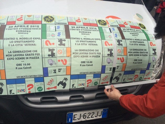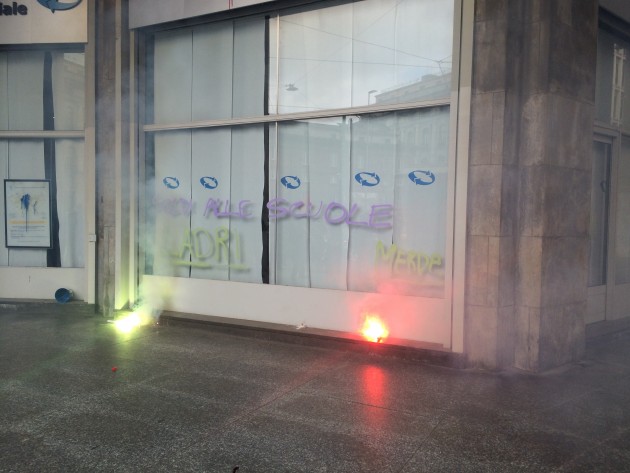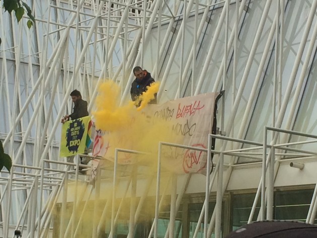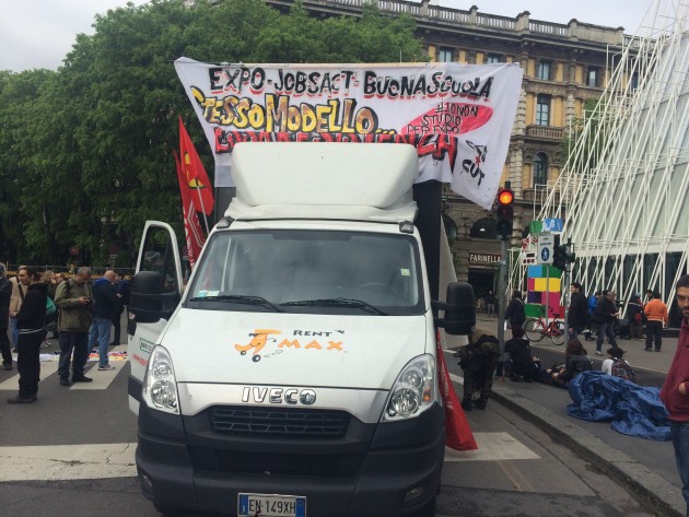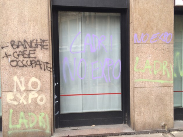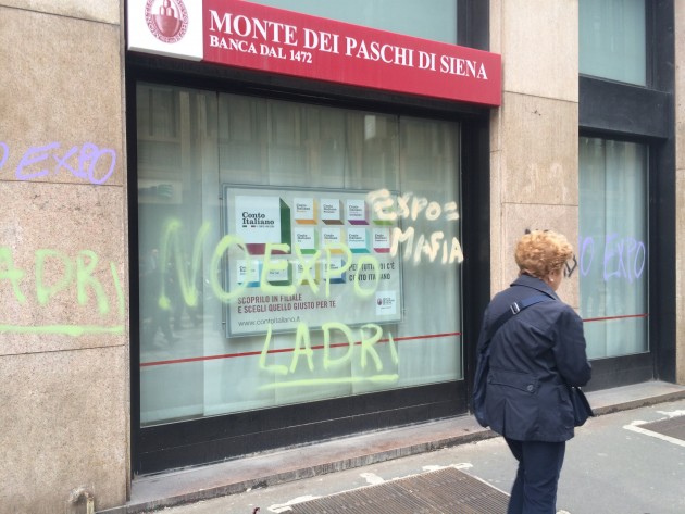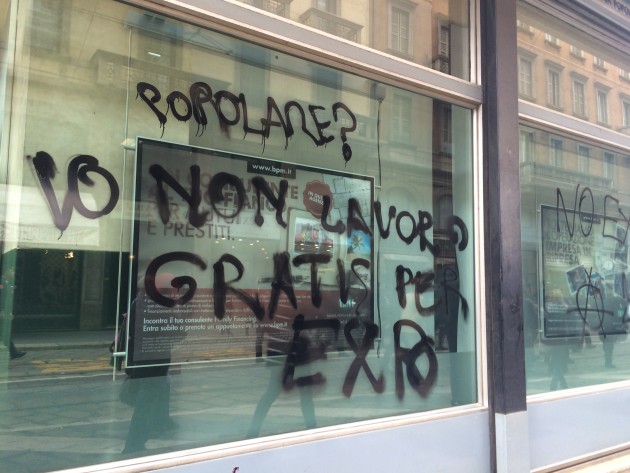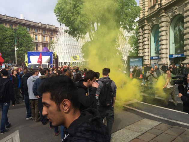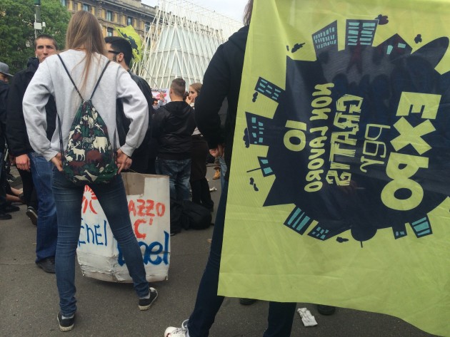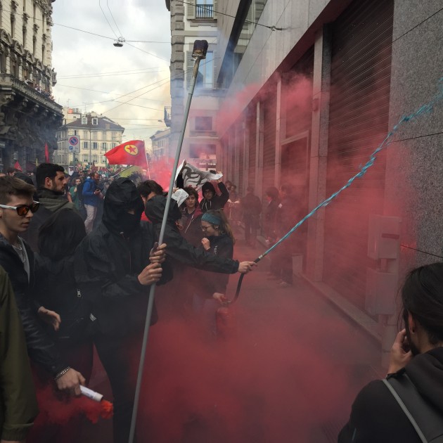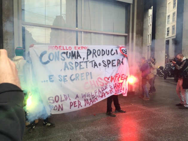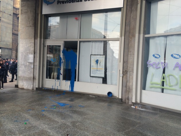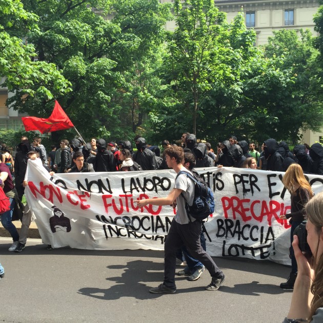 Militanti dei centri sociali e autonomi hanno sfiorato la rissa in viale Majno, davanti alla sede di Manpower, azienda incaricata della gestione del personale per Expo 2015 e al centro delle polemiche nei giorni scorsi per aver diffuso la notizia che molti under 29 avrebbero rifiutato un contratto da 1500 euro. Una decina di attivisti di collettivi e centri sociali milanesi, incappucciati e vestiti di nero, si sono staccati dal corteo e hanno lanciato uova riempite di vernice contro l’edificio. Subito dopo sono entrati in scena una ventina di ragazzi col passamontagna sul volto, martelli e sassi in mano, che si sono scagliati contro le vetrate dello stabile. La polizia in tenuta antisommossa si è piazzata subito davanti all’edificio di Manpower. Nessuna carica. Nessun contatto fisico. Gli autonomi sono indietreggiati e hanno ripreso posto nel corteo, ma sono stati avvicinati da alcuni ragazzi dei centri sociali che hanno considerato l’azione un boomerang per la protesta. Insulti e spintoni. Qualche minuto di tensione. Questi gli unici episodi di violenza – insieme a qualche scritta sui vetri di una decina di banche – che si sono registrati alla manifestazione partita da largo Cairoli e conclusa a piazzale Gioia, non lontano dalla stazione centrale.