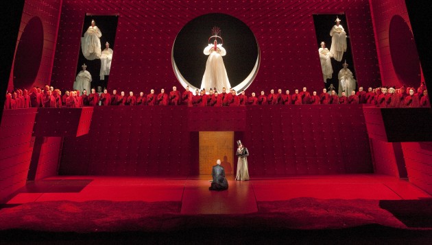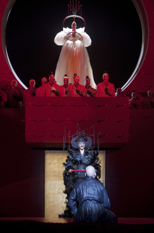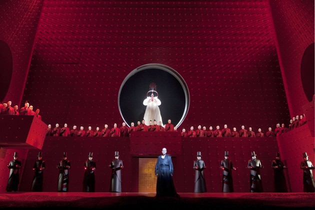 Nella regia del tedesco Nikolaus Lehnhoff, Turandot si copre di eleganza figurativa, con la crudele regina pechinese ammantata di un’eleganza quasi gotica, al centro di una scenografia squadrata, resa ancor più imponente da pervasive luci rosse. Una scena che resta immutata durante le tre ore di spettacolo, ma che i passaggi di luce dipingono come un’enigmatica prigione iniziale, per poi ritrarla come un’accecante luogo di luce sul finale, quando Turandot si spoglia del sui costume (che nelle intenzioni del regista dovrebbe farla sembrare “un grande insetto con un grosso mantello”) e si abbandona all’amore. Altra novità del finale, il fatto che il corpo di Liù, la vittima sacrificale della relazione tra Calaf e Turandot, è tenuto sul palco anche dopo la sua morte: un lieto fine, quindi, umanizzato e senza eccessivi trionfalismi. Colpirà – o quanto meno farà sorridere – anche il contrasto tra il registro della trama principale dell’opera e gli alleggerimenti di Ping, Pong e Pang, i tre ministri del regno con creste, bretelle e bombette che bevono birra e guardano un poster di una giovane pin up.