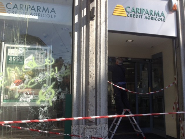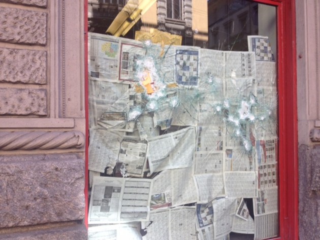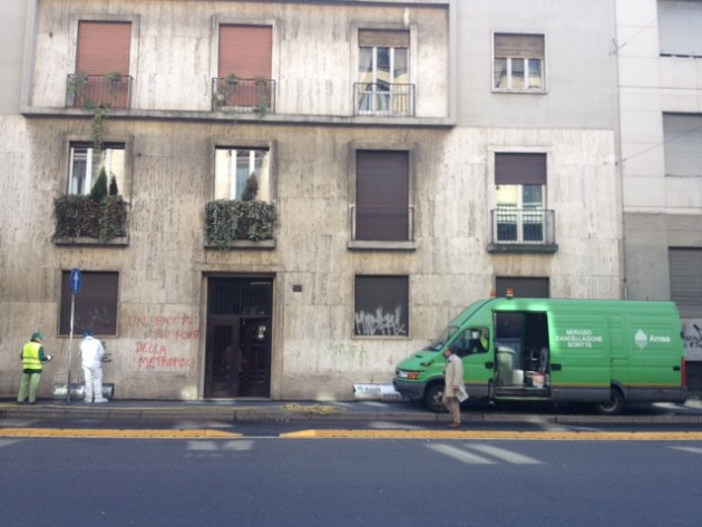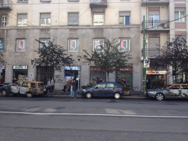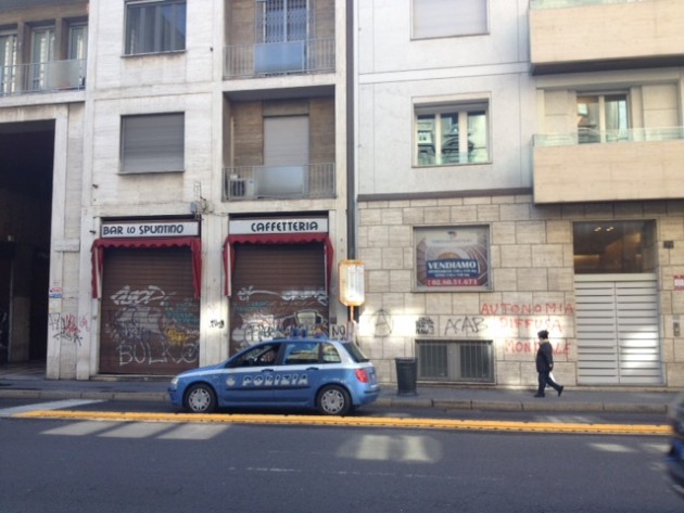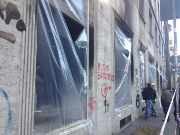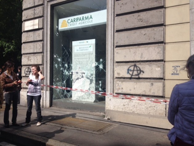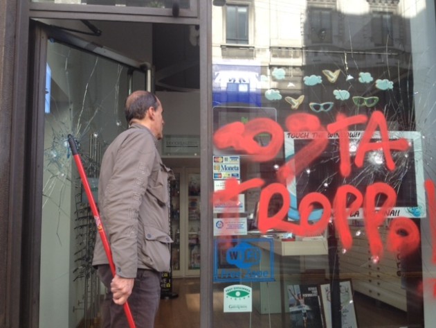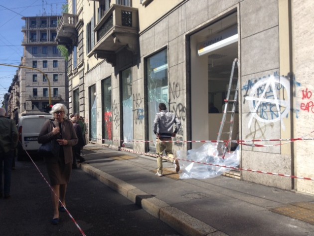 Stazione Cadorna, via Carducci, pieno centro di Milano. Ecco le immagini del giorno dopo il corteo NoExpo, dove centinaia di black bloc hanno devastato vetrine della posta, di negozi e banche. Tanti i muri imbrattati con le scritte, da NoExpo a NoTav, che i dipendenti dell’Amsa stavano ripulendo. In mattinata erano ancora in strada anche alcune delle auto bruciate.