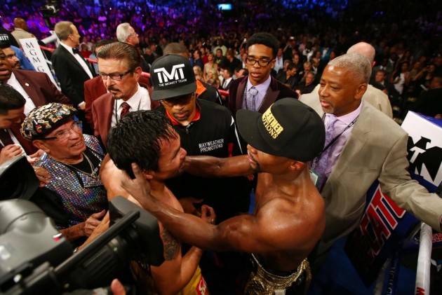 Vittoria ai punti per Floyd Mayweather jr che ha battuto Manny Pacquiao. Sono state dodici le riprese sul ring della MGM Grand Garden Arena di Las Vegas in quello che era stato definito il ”match del secolo” per il titolo mondiale dei pesi welter. Floyd Mayweather jr, che rimane imbattuto con uno score di 48 match vinti su 48, ha battuto largamente il suo avversario nel giudizio di tutti i tre giudici del combattimento. Per questo incontro Mayweather ha ottenuto 120 milioni di dollari e Pacquiao 80 milioni di dollari.