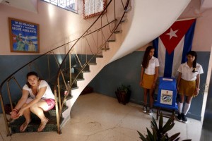 A young woman sits on a staircase as two school girls stand next to a ballot box at a polling station at a school in Havana April 19, 2015. The municipal elections take place in Cuba today. The writing on the poster showing Cuba’s former President Fidel Castro (L) and his brother Cuba’s President Raul Castro reads, "The revolution, powerful and victorious, goes ahead". REUTERS/Stringer