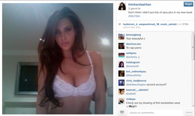 Il libro con gli autoscatti privati della regina dei reality show americani costa 20 dollari: proprio qualche giorno fa, la ricca ereditiera aveva condiviso con i suoi molti fan alcune foto particolarmente disinibite ‘dedicate’ al marito Kanye West. E quella di condividere foto sui social sembra essere una vera e propria ‘professione‘ per la Kardashian: sono 2667 le foto postate su Instagram.