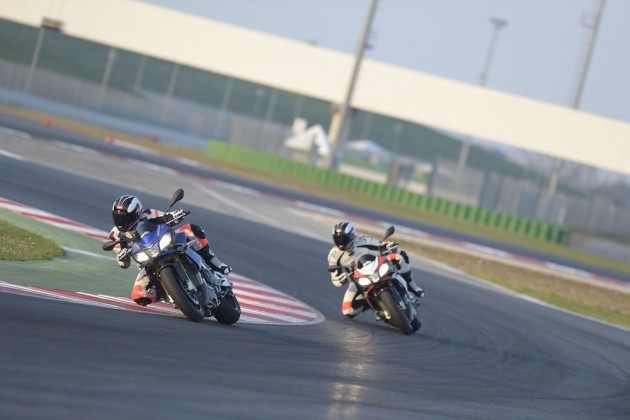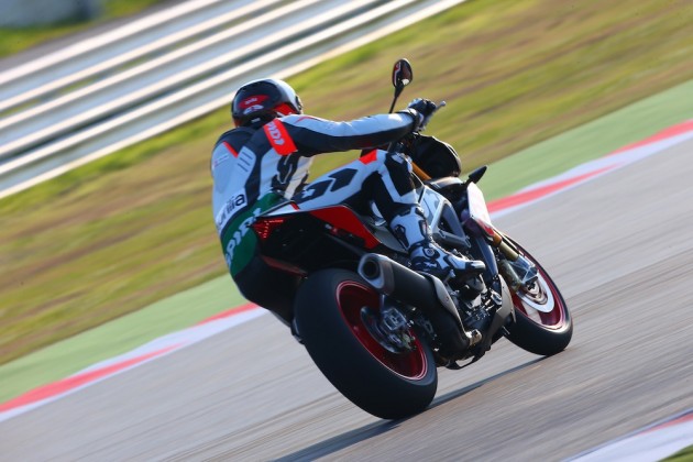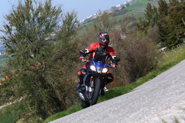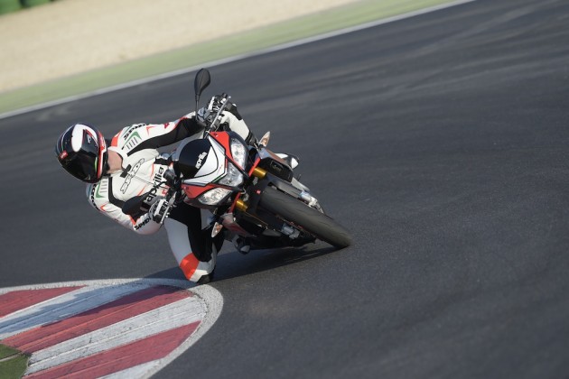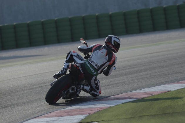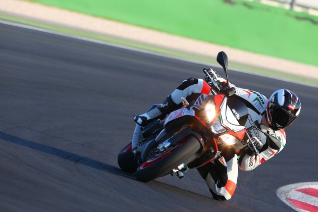 Ma anche se civilizzata, la sua anima di moto da corsa trasuda da ogni dettaglio e si risveglia non appena si accende il motore. Il suono è di quelli che non lasciano dubbi e la sella bella sottile ricorda – semmai uno fosse riuscito a scordarselo – che quando si ruota la manetta c’è poco da scherzare. Sicuramente non è una moto adatta ai neofiti, sebbene il pacchetto di sistemi di assistenza alla guida (sportiva) APRC – Aprilia Perfomance Ride Control riesca a renderla del tutto inoffensiva. Con l’Abs la frenata è sotto controllo, al pari della trazione e dell’impennata. Ognuno dei tre dispositivi è regolabile, separatamente e su vari livelli, ma volendo si può anche disinserire. Francamente non ha nessun senso farlo, nemmeno in pista, dove anche i piloti professionisti sono più veloci con un piccolo “aiutino” dell’elettronica. La serietà con cui va condotta la Tuono, quindi, non ha nulla a che vedere con la sua sincerità, che è totale, o con qualche pecca della ciclistica. La moto fa esattamente quello che vuole il pilota, ha una stabilità esemplare e una velocità di ingresso in curva fulminea.