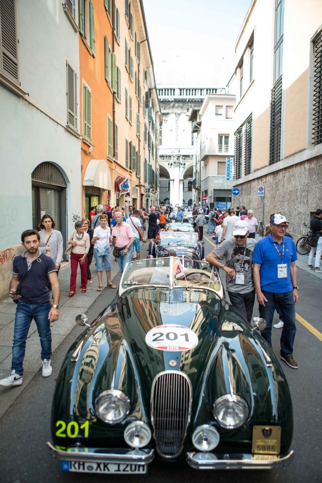 Le auto. Alla Mille Miglia si possono iscrivere i modelli di cui almeno un esemplare abbia preso parte, o almeno si sia iscritto, a una delle edizioni di velocità degli anni 1927-1957 (qui l’elenco delle vetture candidabili). Per omogeneizzare le differenze fra auto di epoca tanto diversa, a ogni vettura viene attribuito in coefficiente che viene poi moltiplicato per il punteggio ottenuto in gara. Fra i gioielli alla partenza, 38 Alfa Romeo e Mercedes, 36 Jaguar, 34 Fiat, 30 Lancia e 22 Porsche. Oltre alle auto private, sono in griglia di partenza anche molte vetture “ufficiali”. Per festeggiare i 60 anni dalla vittoria del 1955, quando Sir Stirling Moss percorse 1.600 km in poco più di 10 ore, la Mercedes porta alla Mille Miglia 2015 ben 15 auto, fra cui proprio la vittoriosa 300 SLR numero 722. L’Alfa Romeo, che vinse ben 11 edizioni della Mille Miglia originaria, schiera due vetture ufficiali del Museo Storico Alfa Romeo, la 1900 Sport Spider (1954) e la 750 Competizione (1955). La Lancia porta una Aurelia B20 GT del 1951 e una Ardea berlina prima serie del 1939. La Jaguar festeggia gli 80 anni con diverse C-Type e D-Type, BMW corre con cinque 328.