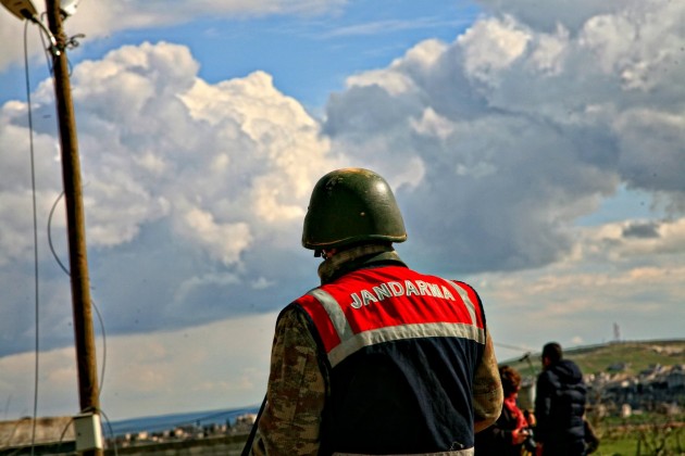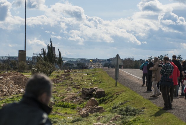 Vogliamo portare la nostra solidarietà a Kobane e ci dirigiamo verso il confine. Arrivati al confine vediamo sventolare all’orizzonte la bandiera dell’YPG, illuminata da un raggio di sole. La Rojava Autonoma è a poche centinaia di metri, la città si stende davanti a noi, davanti alla collina su cui dal 26 gennaio è issata bandiera curda. Finalmente ci siamo, il centro del mondo è qua, davanti a noi. Ci chiedono i passaporti, siamo 60, tutti italiani, vogliamo stare in Rojava solo per qualche ora. Il nostro accompagnatore parla in turco con il militare, sorride verso di noi dicendo che “dai, forse passiamo”. Il militare telefona in prefettura. Niente da fare.
