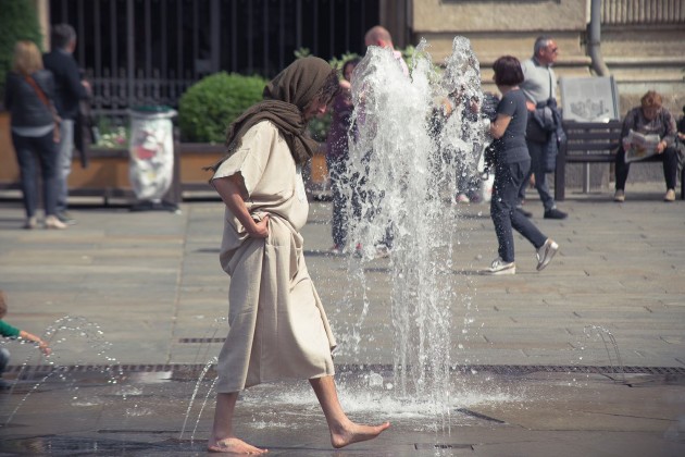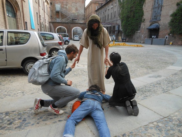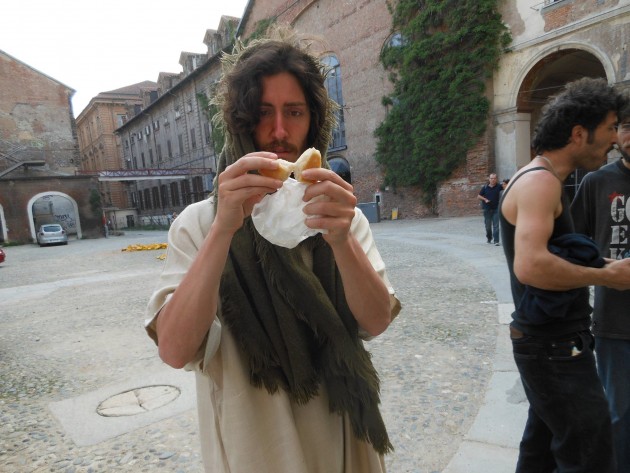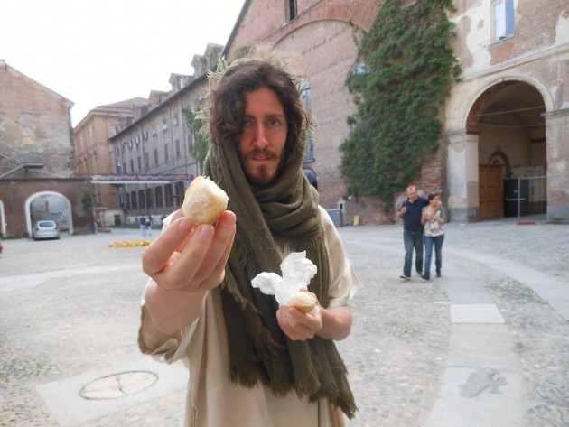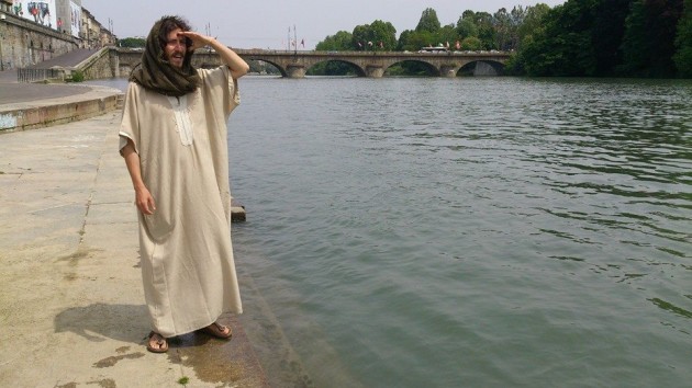 A Torino, città custode della Sacra Sindone, da qualche tempo “lavora” un ragazzo che travestito da Gesù si aggira per le vie declamando parabole, dispensando abbracci e facendo selfie coi turisti. Con sè porta una cesta per raccogliere le offerte.