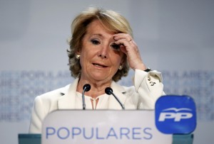 Esperanza Aguirre, local candidate for ruling People’s Party (PP), gestures as she delivers a speech at party’s headquarters after the regional and municipal elections in Madrid, Spain, May 24, 2015. Spain’s ruling People’s Party (PP) has won the municipal election in the country’s capital Madrid but it could lose control of the city council for the first time since 1991, official data with 97 percent of the votes counted showed. REUTERS/Juan Medina