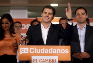 Ciudadanos’ party leader Albert Rivera (C) gestures as he speaks after the regional and municipal elections at a hotel in Madrid, Spain, May 24, 2015. Spain’s ruling People’s Party (PP) took a battering in regional elections on Sunday with Spaniards punishing Prime Minister Mariano Rajoy for four years of severe spending cuts and a string of corruption scandals. REUTERS/Susana Vera