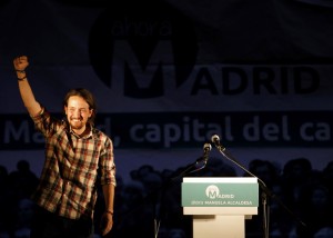 Podemos (We can) leader Pablo Iglesias, acknowledges applauds from supporters after the regional and municipal elections in Madrid, Spain, May 25, 2015. Spain’s ruling People’s Party (PP) took a battering in regional elections on Sunday with Spaniards punishing Prime Minister Mariano Rajoy for four years of severe spending cuts and a string of corruption scandals. REUTERS/Paul Hanna