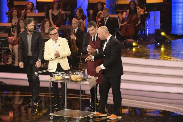 Mezz’ora più tardi è toccato ai tre giudici di “Masterchef” salire sul palco per ricevere il premio per il talent show culinario: i tre hanno coinvolto Frizzi, sfidandolo a pelare quante più patate possibili in un minuto. A prova finita, Bastianich afferra una patata e si è diretto verso Ricci, che sedeva in prima fila: “Devo regalare una cosa al mio amico… Perché nella vita a volte non bisogna parlare, ma pelare le patate“. Secca la risposta dell’ideatore di Striscia: “È giusto pelare le patate visto che noi vi abbiamo pelato ben bene…”