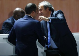 UEFA President Michel Platini (R) greets Prince Ali bin Al Hussein of Jordan, FIFA presidential candidate, at the 65th FIFA Congress in Zurich, Switzerland, May 29, 2015. The embattled head of world soccer, FIFA President Sepp Blatter, is expected to be re-elected on Friday despite growing calls for his resignation amid a corruption scandal that has engulfed the sport’s governing body. REUTERS/Ruben Sprich