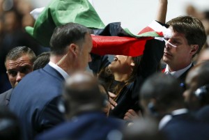 Security officers block a pro-Palestine protestor at the 65th FIFA Congress in Zurich, Switzerland, May 29, 2015. The embattled head of world soccer, FIFA President Sepp Blatter, is expected to be re-elected on Friday despite growing calls for his resignation amid a corruption scandal that has engulfed the sport’s governing body. REUTERS/Arnd Wiegmann