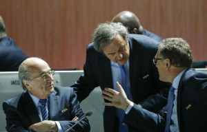 UEFA President Michel Platini (C) speaks with FIFA President Sepp Blatter (L) and Jerome Valcke, Secretary General of the FIFA, at the 65th FIFA Congress in Zurich, Switzerland, May 29, 2015. The embattled head of world soccer, FIFA President Sepp Blatter, is expected to be re-elected on Friday despite growing calls for his resignation amid a corruption scandal that has engulfed the sport’s governing body. REUTERS/Ruben Sprich