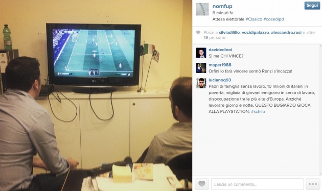 L’attesa elettorale del presidente del Consiglio Matteo Renzi e del presidente del Pd Matteo Orfini? Ai joystick della playstation. Si tratta di una partita di calcio e sul profilo Instagram di Filippo Sensi, portavoce di Renzi, si viene a sapere che si tratta di Pes, cioè Pro Evolution Soccer, tra i videogame di calcio più diffusi. La stanza sarebbe quella dell’ufficio di Orfini.