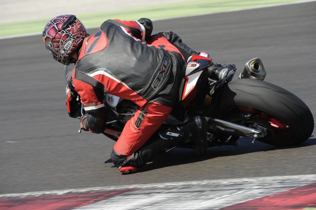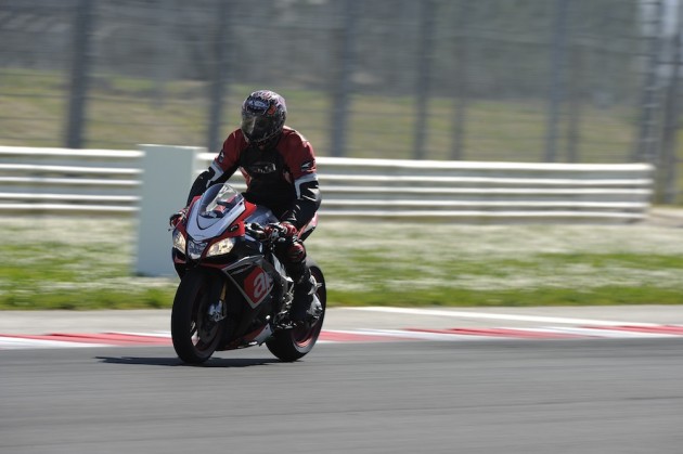 Considerate le prestazioni di cui questa moto è capace, andare forte è sorprendentemente facile. L’elettronica vigila con discrezione e il comportamento dinamico è così sano che per scomporla bisogna essere davvero alla ricerca del limite – una cosa per pochi – oppure compiere un errore grossolano. Attenendosi alle semplici regole della guida in pista, usando un po’ di buon senso e avendo il fegato di fare il Curvone a 220 km/h con il ginocchio fuori, anche il più scarso degli amatori (come me) può girare a Misano in 1’55, cioè solo 20 secondi più lento di un pilota di Superbike, senza prendersi il benché minimo rischio. Questo perché tu pensi e la RSV4 esegue, ubbidiente come un predatore selvaggio ben addestrato, che sa di essere letale ma ubbidisce agli ordini del domatore, perché in fondo gli vuole bene.