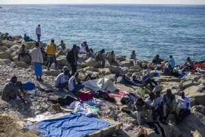Nella foto: Migranti attendono sugli scogli al confine con la Francia;