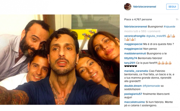 A poche ore dalla scarcercazione e dall’affidamento in prova alla comunità di Don Mazzi, Fabrizio Corona torna sui social in prima persona, pubblicando il primo selfie da uomo libero. Nella foto, pubblicata sul profilo ufficiale su Instagram, l’ex manager dei paparazzi è in compagnia di altre quattro persone, tutte taggate: Assunta Di Prisco, Francesca Persi, Armando Limone e Christian Contessa.