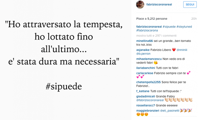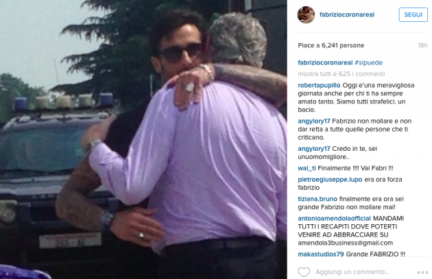 Non è ancora tempo di sorrisi, almeno non in foto, per un Fabrizio Corona che si limita a guardare dritto in camera con uno sguardo che tradisce qualche comprensibile patimento. A meno di un’ora dalla pubblicazione, il selfie ha già collezionato 4600 “cuoricini” (l’equivalente su Instagram del “like” di Facebook) e oltre 600 commenti. Così come era stato accolto con entusiasmo lo scatto di ieri sera, che immortalava l’abbraccio di Corona con un signore la cui identità non è nota, mentre sullo sfondo si intravedeva l’automobile della Polizia Penitenziaria.