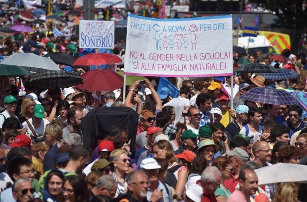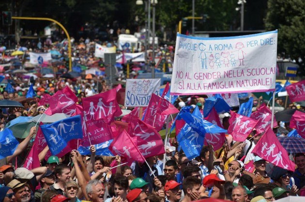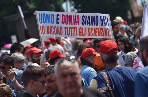 Tutela della famiglia “tradizionale” e solo di quella, accompagnata dallo slogan “Difendiamo i nostri figli. Stop gender nelle scuole” e da un ritratto della Madonna con il Bambino, posizionato sul palco. Dal quale interviene pure l’imam di Centocelle, perché “anche la comunità islamica è contro questo progetto pericoloso che vuole inquinare i cervelli dei nostri figli”. E’ il giorno del Family Day, manifestazione iniziata in piazza San Pietro a Roma sotto la pioggia battente e nata in seno al mondo cattolico contro il ddl Cirinnà (qui il contenuto del testo) a favore dei matrimoni gay. Al centro anche la protesta contro la teoria del gender – definita da Papa Francesco “espressione di frustrazione che mira a cancellare la differenza sessuale“ – secondo cui a definire l’orientamento sessuale dell’individuo non sia il corredo genetico, ma un insieme di elementi culturali. Secondo gli organizzatori i manifestanti sono “più di un milione”, ma i dati del Viminale ridimensionano le stime e parlano di 400mila presenze.