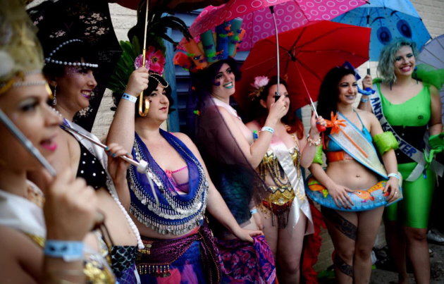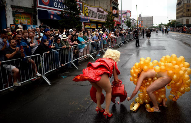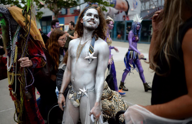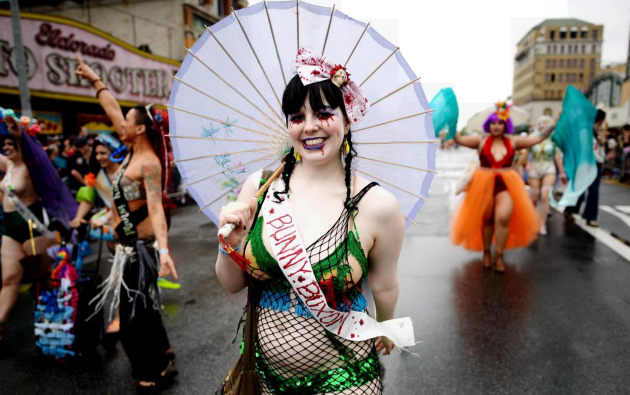 E la pioggia newyorkese non ha intimorito gli eccentrici partecipanti di questa edizione: “E’ ancora più divertente se piove, siamo tutte creature marine”, ha detto Joe Coddington di Queens, che indossava un cappello granchio e una maglietta che diceva “spalmami di burro”. Make up vistosi, look che sublimano l’idea di kitsch, sorrisi disinvolti e comitive al limite del surreale per uno spettacolo unico: quest’anno, lo scettro di regina Mermaid lo portava la ballerina di burlesque Julie Atlas Muz, mentre Re Nettuno era impersonato dall’attore Mat Fraser. Nel 2014 suscitò grande scalpore il sindaco di New York, Bill de Blasio, che si presentò alla sfilata presentato in costume da pirata. Questa volta, però, ha dato forfait.
