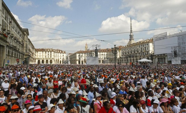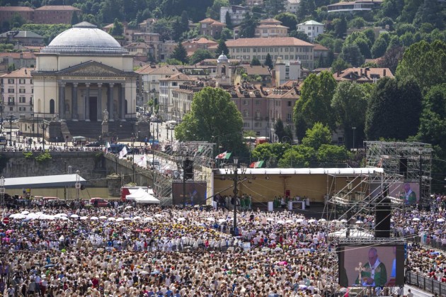 Bergoglio ha poi visitato la Cattedrale, dove si è fermato in preghiera davanti alla Sindone, dicendo che “attira verso il volto e il corpo martoriato di Gesù e, nello stesso tempo, spinge verso il volto di ogni persona sofferente e ingiustamente perseguitata”. Dopo la visita alla Sindone è andato a Piazza Vittorio, dove ha tenuto la Messa e l’Angelus. Qui ha avuto tempo per un fuori programma legato alle sue origini piemontesi, parlando di Torino come di “questa terra benedetta, della quale io sono nipote”. Questa parte non era contenuta nel testo dell’Angelus distribuito ai giornalisti. Bergoglio lo ha aggiunto a braccio.