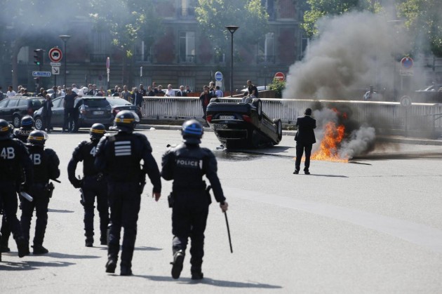 Uber, a Parigi la protesta dei tassisti: copertoni in fiamme, auto ribaltate e blocchi (FOTO)