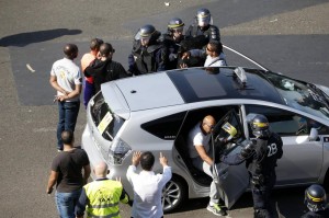 French taxi drivers, who are on strike, face with French riot police during a demonstration at Porte Maillot to block the traffic on the Paris ring road during a national protest against car-sharing service Uber, in Paris, France, June 25, 2015. French taxi drivers stepped up protests against U.S. online cab service UberPOP on Thursday, blocking road access to airports and train stations in Paris and other cities. REUTERS/Charles Platiau