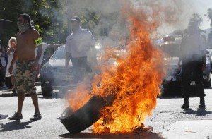 Taxi drivers on strike burn tyres during a national protest against car-sharing service Uber in Marseille, France, June 25, 2015. French taxi drivers stepped up protests against U.S. online cab service UberPOP on Thursday, blocking road access to airports and train stations in Paris and other cities. REUTERS/Jean-Paul Pelissier