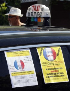 A leaflet which reads "Uber stop, outlaw" is seen on a taxi as striking French taxi drivers block the traffic during a national protest against car-sharing service Uber in Marseille, France, June 25, 2015. French taxi drivers stepped up protests against U.S. online cab service UberPOP on Thursday, blocking road access to airports and train stations in Paris and other cities. REUTERS/Jean-Paul Pelissier