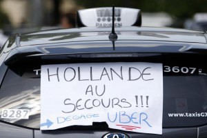 A leaflet which reads "Hollande help us ! Uber go home" is seen on a taxi as striking French taxi drivers block the traffic on the Paris ring road during a national protest against car-sharing service Uber, in Paris, France, June 25, 2015. French taxi drivers stepped up protests against U.S. online cab service UberPOP on Thursday, blocking road access to airports and train stations in Paris and other cities. REUTERS/Charles Platiau