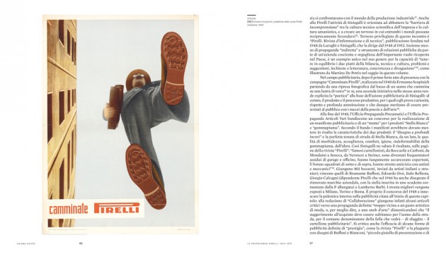 Attraverso centinaia di bozzetti, manifesti, inserzioni su giornali e riviste, viene esaltato il rapporto tra la Pirelli e gli artisti che hanno collaborato alla comunicazione pubblicitaria dell’azienda: dai pittori come Dudovich, Mazza e Cappiello ai pionieri della grafica pubblicitaria come Marcello Nizzoli, Renzo Bassi e Mario Duse. E nel dopoguerra la collaborazione tra arte e Pirelli si è addirittura intensificata, anche grazie al boom della grafica pubblicitaria nel nostro paese, diventata un’eccellenza a livello mondiale: Bruno Munari, Albe Steiner, Bob Noorda, Ezio Bonini, Giulio Confalonieri, Pino Tovaglia, Franco Grignani.