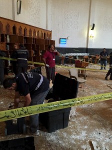 Police inspect the Imam Sadiq Mosque after a bomb explosion, in the Al Sawaber area of Kuwait City June 26, 2015. A suicide bomber blew himself up at the packed Shi’ite Muslim mosque in Kuwait city during Friday prayers, killing more than ten people, the governor of Kuwait City said. REUTERS/Kuwait News Agency
