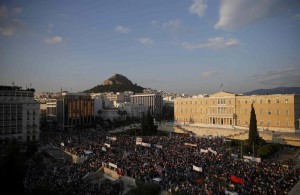 Protesters attend an anti-austerity rally in front of the parliament building in Athens, Greece, June 29, 2015. Stunned Greeks faced shuttered banks, long supermarkets lines and overwhelming uncertainty on Monday as a breakdown in talks between Athens and its international creditors plunged the country deep into crisis. REUTERS/Alkis Konstantinidis