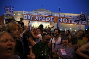 Protesters shout slogans in front of the parliament building during an anti-austerity rally in Athens, Greece, June 29, 2015. Stunned Greeks faced shuttered banks, long supermarkets lines and overwhelming uncertainty on Monday as a breakdown in talks between Athens and its international creditors plunged the country deep into crisis. REUTERS/Alkis Konstantinidis