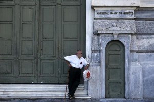 A pensioner waits outside a closed National Bank branch at the bank’s headquarters in Athens, Greece June 29, 2015. Greece’s Prime Minister Alexis Tsipras on Sunday announced a bank holiday and capital controls after Greeks responded to his surprise call for a referendum on bailout terms by pulling money out of banks. REUTERS/Alkis Konstantinidis