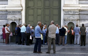 People, most of them pensioners, line up outside a National Bank branch at the bank’s headquarters in Athens, Greece June 29, 2015. Greece closed its banks and imposed capital controls on Sunday to check the growing strains on its crippled financial system, bringing the prospect of being forced out of the euro into plain sight. REUTERS/Alkis Konstantinidis TPX IMAGES OF THE DAY