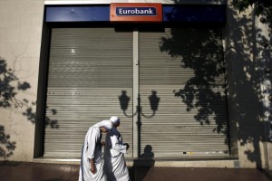 Catholic nuns make their way past a closed Eurobank branch in Athens, Greece June 29, 2015. Greece’s Prime Minister Alexis Tsipras on Sunday announced a bank holiday and capital controls after Greeks responded to his surprise call for a referendum on bailout terms by pulling money out of banks. REUTERS/Alkis Konstantinidis