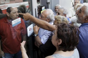 Pensioners waiting outside a closed National Bank branch and hoping to get their pensions, argue with a bank employee (L) in Iraklio on the island of Crete, Greece June 29, 2015. Greeks struggled to adjust to shuttered banks, closed cash machines and a climate of rumours and conspiracy theories on Monday as a breakdown in talks between Athens and its creditors plunged the country deep into crisis. REUTERS/Stefanos Rapanis TPX IMAGES OF THE DAY