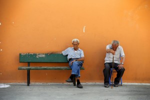 Two men sit on a bench in the village of Meyisti on the Island of Kastellorizo, Greece, July 4, 2015. It was on this island, that former Prime Minister George Papandreou announced in 2010 that Greece required a rescue package. If a ‘No’ in Sunday’s referendum eventually takes Greece out of Europe’s single currency, any "new drachma" or temporary payment unit could be worth as little as a fifth of the euro now in circulation. REUTERS/Cathal McNaughton