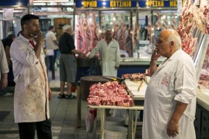 Butchers smoke as they wait for customers at the main food market in Athens, Greece, July 4, 2015. If a ‘No’ in Sunday’s referendum eventually takes Greece out of Europe’s single currency, any "new drachma" or temporary payment unit could be worth as little as a fifth of the euro now in circulation. REUTERS/Marko Djurica