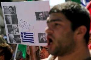 Demonstrators shout slogans against austerity during a protest in support of Greece in front of the European Union office in Nicosia, Cyprus, July 4, 2015. In a tumultuous week, Greece has closed its banks, introduced capital controls and become the first developed country to default on an International Monetary Fund loan. Talks with its creditors over a reforms-for-cash deal are deadlocked, and some analysts think Sunday’s referendum will determine Greece’s future in the euro zone. REUTERS/Yiannis Kourtoglou