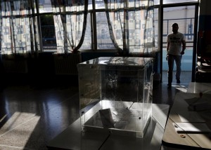 A voter enters a polling station at a school’s classroom in Athens, Greece July 5, 2015. Greece voted on Sunday on whether to accept more austerity in exchange for international aid, in a high-stakes referendum likely to determine whether it leaves the euro-currency area after seven years of economic pain. REUTERS/Yannis Behrakis TPX IMAGES OF THE DAY