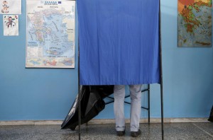 Maps of Greece hang on the wall next to a voting booth in a polling station at a school’s classroom in Athens, Greece July 5, 2015. Greece voted on Sunday on whether to accept more austerity in exchange for international aid, in a high-stakes referendum likely to determine whether it leaves the euro-currency area after seven years of economic pain. REUTERS/Yannis Behrakis