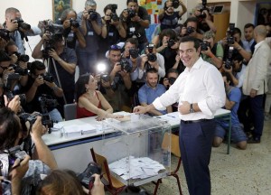 Greek Prime Minister Alexis Tsipras votes at a polling station in Athens, Greece July 5, 2015. Greece voted on Sunday on whether to accept more austerity in exchange for international aid, in a high-stakes referendum likely to determine whether it leaves the euro-currency area after seven years of economic pain. REUTERS/Christian Hartmann