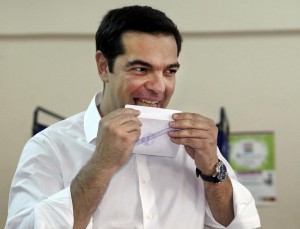 Greek Prime Minister Alexis Tsipras licks his balloit envelope before voting at a polling station in Athens, Greece July 5, 2015. Greece voted on Sunday on whether to accept more austerity in exchange for international aid, in a high-stakes referendum likely to determine whether it leaves the euro-currency area after seven years of economic pain. REUTERS/Alkis Konstantinidis