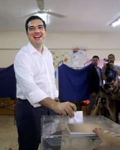 Greek Prime Minister Alexis Tsipras votes at a polling station in Athens, Greece July 5, 2015. Greece voted on Sunday on whether to accept more austerity in exchange for international aid, in a high-stakes referendum likely to determine whether it leaves the euro-currency area after seven years of economic pain. REUTERS/Alkis Konstantinidis