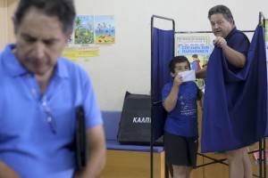 A young boy (C) kisses a ballot as he exits a voting booth with his father (R) at a polling station during a referendum in Athens, Greece July 5, 2015. Greece voted on Sunday on whether to accept more austerity in exchange for international aid, in a high-stakes referendum likely to determine whether it leaves the euro-currency area after seven years of economic pain. REUTERS/Alkis Konstantinidis