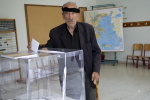 A man wearing a traditional headscarf casts his ballot at a polling station at the village of Anogeia in the island of Crete, Greece July 5, 2015. Greeks voted on Sunday whether to accept or reject the tough terms of an aid offer to stave off financial collapse, in a referendum that may determine their future in Europe’s common currency. REUTERS/Stefanos Rapines