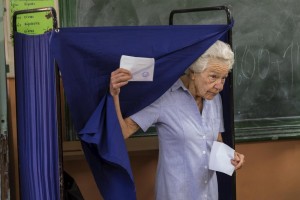 A woman leaves a polling booth to cast her ballot during a referendum vote in Athens, Greece, July 5, 2015. Greece voted on Sunday on whether to accept more austerity in exchange for international aid, in a high-stakes referendum likely to determine whether it leaves the euro-currency area after seven years of economic pain. REUTERS/Marko Djurica