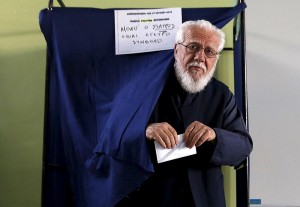 A Greek Orthodox priest exits a booth holding a ballot at a polling station in Athens, Greece July 5, 2015. Greece voted on Sunday on whether to accept more austerity in exchange for international aid, in a high-stakes referendum likely to determine whether it leaves the euro-currency area after seven years of economic pain. REUTERS/Yannis Behrakis